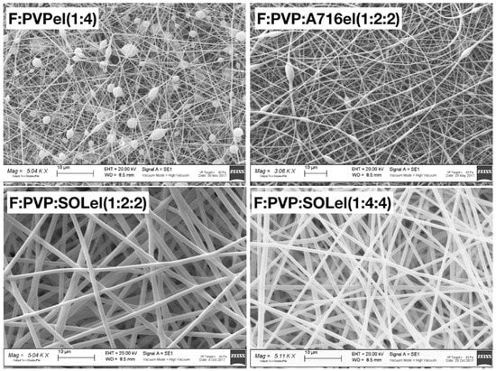 Figure 2. Samples F:PVPel (1:4) and F:PVP:A716el (1:2:2) were characterized by the presence of beads, while the fibers made by the combination of the polymers PVP and SOL, with different percentages of firocoxib, were very homogeneous and regular, and no beads were present.