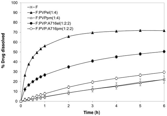 Figure 2), which could suggest a non-homogenous dispersion of the drug inside the fibers. Additionally, the physical mixture, F:PVP:A716pm (1:2:2), did not show a valuable improvement in the dissolution performances of the drug (