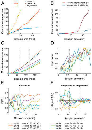Figure 2A,B shows the data from a representative animal confronted with the schedule conc RI 30 s RI 10 s (i.e., concurrent random-interval schedules for RL (30 s) and RR (10 s); accordingly, the right response port was on average armed three times as often as the left response port). As a result of random explorative behavior, the rat began poking into the operant and reward ports almost immediately after introduction into the chamber, thereby triggering occasional rewards.