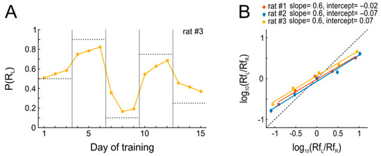 The results from this experiment are summarized in Figure 3. Within the three days of each condition during which reward schedules were kept stable, every animal quickly adjusted its P(RL) such that it approached P(RfL) (matching). Put differently, the probabilistic performance of the animal adjusts to invariant reward availability, which in turn decreases the variance in behavior and maximizes the overall harvested reinforcement, thus approximating optimal behavior as predicted by the matching law (Figure 3A). However, it is evident from Figure 3B that the rats’ actual behavior systematically deviated from the predictions of Equation (1). Since Equation (1) does not provide a sufficiently good expression of the relations between the available and harvested reward of the actual data, we use another equation known as the “Generalized Matching Law” [28],