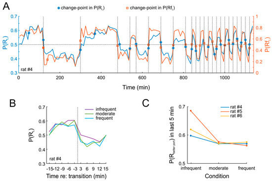 Rats quickly adapt when reinforcement contingencies change multiple times per session. (A) Dynamic response allocation resulting from changes in P(RfL) across all 15 experimental sessions in 10-min bins for an example animal. Blue and red symbols denote change-points for responses (asterisks) and reinforcements (squares). Thin horizontal dotted line denotes unbiased responding; vertical dotted lines denote changes in P(RfL). (B) Relative choice proportion before and after changes in reinforcement contingency (vertical dotted line) for infrequent (purple), moderately frequent (green), and frequent (cyan) changes. The data from the other rats tested with different sequences were highly similar. (C) Comparison of relative response proportions during the last five minutes prior to transitions across all three conditions.