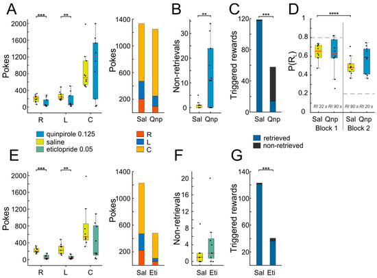 Not unexpectedly, the effects of eticlopride differed from those of quinpirole. While eticlopride also led to a drastic reduction in operant responding (Figure 6E, n = 9, right port: T(8) = 4.87, p = 0.001; left port: T(8) = 3.8, p = 0.005), in turn resulting in low numbers of triggered rewards (Figure 6G, T(8) = 4.8, p = 0.001), unlike quinpirole, the number of non-retrieved rewards was not affected (Figure 6F,G, T(8) = 1.35, p = 0.21), indicating that responding to the reward signaling cue remained intact.