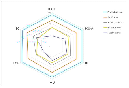 Abundance of the main phyla in the hospital facilities. Relative abundances are shown as percentages (%) on a log scale. Abbreviations: ECU, Emergency Care Unit; MU, Medical Unit; SC, Surgery Center; IU, Inpatient Unit; ICU-A, Intensive Care Unit A; ICU-B, Intensive Care Unit B.