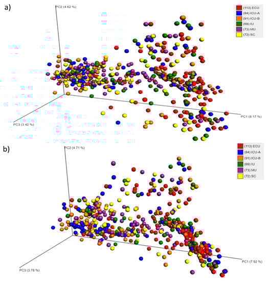 Principal coordinates analysis (PCoA) plot based on Bray-Curtis (a) or Sorensen-Dice (b) dissimilarities, depicting the clusters of bacterial communities grouped according to the facility category. Abbreviations: ECU, Emergency Care Unit; MU, Medical Unit; SC, Surgery Center; IU, Inpatient Unit; ICU-A, Intensive Care Unit A; ICU-B, Intensive Care Unit B.