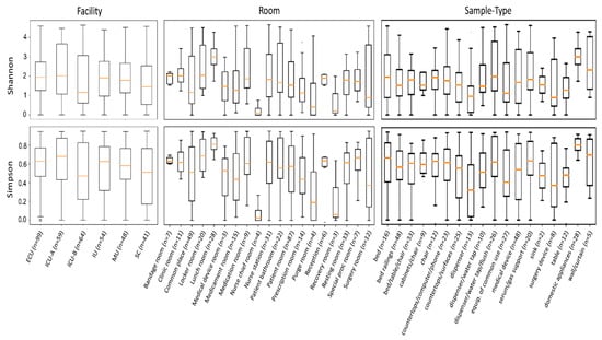 Boxplots showing the distribution of Shannon and Simpson diversity indices for samples grouped in the facility, room, and sample type categories. Abbreviations: ECU, Emergency Care Unit; MU, Medical Unit; SC, Surgery Center; IU, Inpatient Unit; ICU-A, Intensive Care Unit A; ICU-B, Intensive Care Unit B.