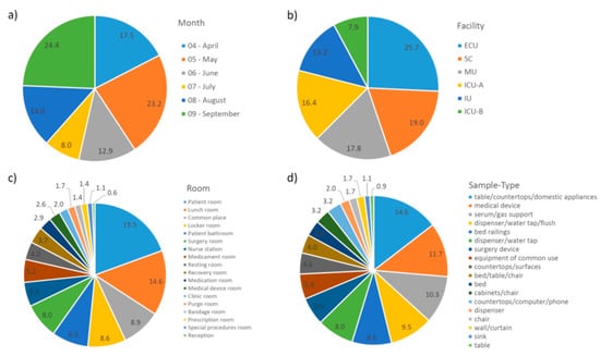 The study was carried out at a tertiary-level teaching hospital with 200 beds located in southern Brazil. 111 surface samples were collected monthly at six hospital facilities between April–September 2015, including two intensive care units (ICU-A and ICU-B), one surgery Ccenter (SC), one medical unit (MU), one inpatient unit (IU), and one emergency care unit (ECU). In total, 663 samples were collected during the six-month period of the study (three samples were discarded due to problems during the sequencing). The types of surfaces sampled within the facilities were chosen based on the frequency with which the surfaces were touched (here defined as high-touch surfaces), such as workstations, medical, and surgical devices. All sampling locations and their characteristics are given in Supplementary Table S1. Beyond individual characterization, samples were also grouped in four categories, named month, facility, room, and sample type. For example, all samples collected in April were grouped in the “April” month category, all samples collected in the emergency care unit during the six-month period of sampling were grouped in the “ECU” facility category. Room and sample type categories followed the same principle.