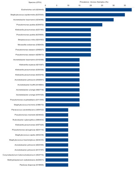 Out of the total 878 bacterial OTUs identified in the hospital community, 32 were present in more than 10% of the samples (Figure 5), and 70 were present in more than 5% of the samples. The three most abundant were Escherichia coli–OTU624449 (38%), Staphylococcus epidermidis–OTU623550 (35%), and Acinetobacter baumannii–OTU624096 (30%). Here as well, the presence of several nosocomial pathogens was notable. Indeed, 30% of the OTUs present in more than 5% of the samples were composed of nosocomial pathogens and 20% of rare nosocomial pathogens. Only 14% were composed of non-pathogens. The pathogen status of the 70 OTUs is presented in Table S5.