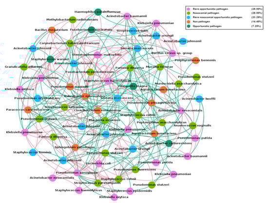 To further explore the clinical relevance of the spatial co-occurrence network from the hospital microbiota, we analyzed the interaction patterns of non-pathogenic species against nosocomial and rare nosocomial pathogens. The results indicated that 43.47% of the interactions were negative, including negative interactions with several nosocomial pathogens like Acinetobacter nosocomialis, Klebsiella pneumoniae, Serratia marcescens, and Staphylococcus haemolyticus (Table S6).
