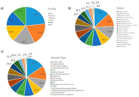 Due to the high number of samples with no reads, we tried to find any pattern related to them. In this regard, samples were grouped in different categories. The results are summarized in Figure 7. In terms of facilities, SC (33.3%) followed by both ICU-A (27.8%) and ICU-B (26.3%) presented the highest percentages of samples with no reads. Purge room (50.0%), surgery room (45.8%), recovery room (44.4%), and medication room (33.3%) presented the highest percentages of samples with no reads, while reception (0.0%), nurse chief room (2.8%), resting room (2.8%), and lunch room (3.3%) presented the lowest. Sample types related to these rooms followed the same pattern.