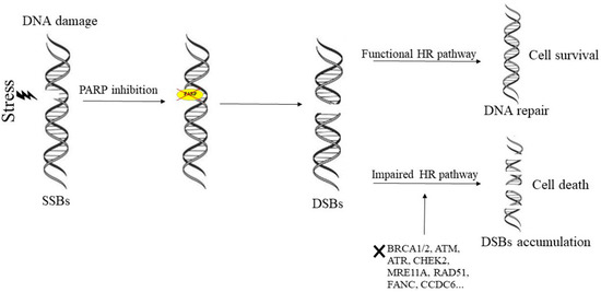 Synthetic lethality of PARP-inhibitors in HR-deficient tumors. Several stress can generate the single strand breaks (SSBs) that are repaired by poly(ADP-ribose) polymerases (PARPs) through the BER pathway. PARP inhibition prevent the repair of SSBs, resulting in the generation of double strand breaks (DSBs). The DSBs are repaired in cells through the functional HR-mediated DNA repair pathway, but in the presence of impaired HR pathway the DSBs cannot be effectively repaired resulting in DSB accumulation, genomic instability, and cell death.