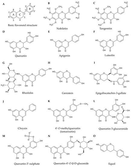 Structures of selected natural flavonoids and metabolites: (A) The basic structure of flavonoids. A, B, and C denote the A-ring, B-ring, and C-ring respectively. Nobiletin (B) and tangeretin (C) are both heavily methoxylated. Quercetin (D), apigenin (E), and luteolin (F) possess similar structures but differ in the extent of their hydroxylation. Rhoifolin (G) is a flavonoid with a glycoside bond at C7 on the A-ring. Genistein (H) has a simple structure similar to apigenin; however, the B-ring is connected at C3 rather than C2. Epigallocatechin-3-gallate (I) possesses an ester bond connecting the phenyl ring to the flavonoid core. Chrysin (J) is a very simple flavonoid with no hydroxyl groups attached to the phenyl B-ring. 4′-O-methylquercetin (K), quercetin-3-glucuronide (L), and quercetin-3′-sulphate (M) are metabolites of quercetin and are either methylated, glucuronidated, or sulphated, respectively. Quercetin-4′-O-β-d-glucoside (N) has a glucosidic bond at the 4′ position. Equol (O) is a metabolite that is produced by gut bacteria.
