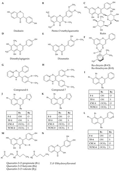 Flavonoids (Figure 1A) are naturally occurring yet structurally diverse compounds that share a common core and are found primarily in plants in which they have multiple roles. They are regularly consumed as part of a routine diet. In plants, they act as antioxidants to remove free radicals and to aid in growth and development; some are involved in immune defence due to their ability to act as antimicrobial compounds [,]. Furthermore, due to their ultraviolet radiation-protective properties, flavonoids have been hypothesised to have been critical for the transition of plants to the land []. Indeed, flavonoids are highly noticeable in plants because they also function as attractants for pollinators and seed dispersors by providing colour to flowers and fruits. However, as flavonoids are present in all plant structures, they are also available for consumption by humans and other animals []. As flavonoids have been shown to possess many beneficial effects for humans including within disease states, they have been identified as potential candidates for synthetic modifications for the development of novel therapeutic agents. Despite their beneficial effects, natural flavonoids lack sufficient bioavailablity, solubility, stability, lipophilicity, and efficacy. In addition, they have multiple targets in cellular systems. However, the ability to modify the structures of naturally occurring flavonoids has led to the development of synthetic compounds with improved biological characteristics for the treatment of multiple ailments via diverse mechanisms. These modifications also promote specificity to the desired molecular target, improve the bioavailability, and increase resistance to first-pass metabolism. Flavonoids have already yielded a source of pharmacological compounds such as LY294002, a phosphoinositide-3-kinase (PI3K) inhibitor based on the structure of quercetin [].