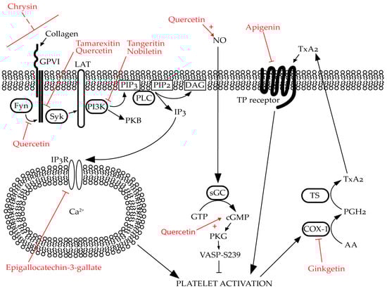 Numerous naturally occurring flavonoids have been tested extensively on the modulation of platelet activation, thrombosis, and haemostasis. The previous studies have provided detailed information on the ability of naturally occurring flavonoids to affect the diverse functions of platelets. Moreover, some of these studies have identified specific molecular targets for the flavonoids in platelets. Interestingly, some studies demonstrate that flavonoids have many targets both on the platelet surface and intracellularly, as flavonoids have been shown to be internalised in platelets [,]. Here, we briefly discuss the impact of specific naturally occurring flavonoids on the modulation of platelet function.