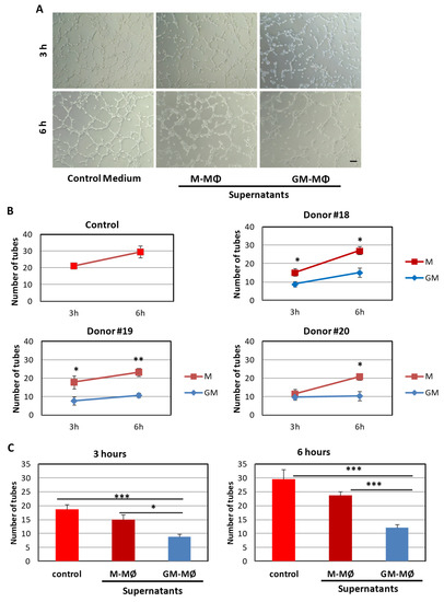 Effect of GM-MΦ and M-MΦ supernatants on tubulogenesis. Matrigel was mixed (at 1:1 dilution) with control medium or macrophage (MΦ) supernatants from three different donors (#18, #19, and #20), and the mixture was added to plates and incubated for 1 h. Then, human umbilical vein-derived endothelial cells (HUVECs) in vascular endothelial growth factor (VEGF)-enriched EBM2/EGM2 medium were added to Matrigel plates and incubated for the times indicated at 37 °C. The cord network formation was visualized by taking pictures at 3 h and 6 h after cell plating and representative images are shown (A). The appearance of an almost complete network is achieved by 6 h in cells incubated with control medium or cells treated with M-MΦ supernatants; while in the presence of GM-MΦ supernatants, open tubules with some patches of disorganized and sparse cells are observed. Scale bar: 100 μm. The number of closed tubes in the network was quantified and representative assays of more than three different experiments per condition are shown (B). The mean number of closed tubes, representing all the experiments (n = 6), is shown by histograms (C). Statistical significance was calculated with one way ANOVA and data are presented as mean ± SEM. (*p < 0.05; **p < 0.01; ***p < 0.001).