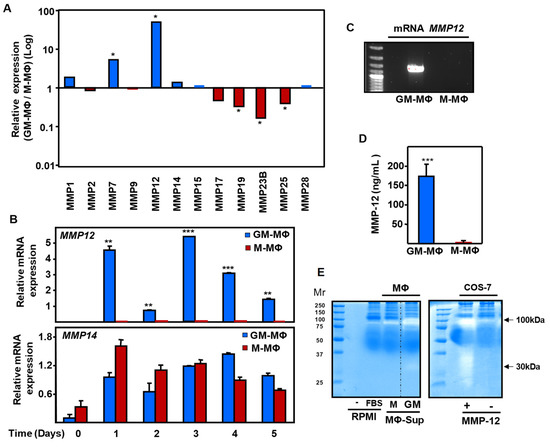 In order to identify the specific component of the GM-MΦ secretome involved in this inhibitory activity, we next analyzed the relative expression profile of different MMPs in GM-MΦ and M-MΦ by qRT-PCR. Of note, the family of MMPs has been shown to regulate vascular endothelial function [18,19]. As shown in Figure 2A, the metalloelastase MMP-12 displayed the highest GM-MΦ/M-MΦ ratio among 12 different MMPs analyzed. In addition, most of the MMPs, except MMP-7, showed relatively low expression levels in GM-MΦ compared to M-MΦ. A kinetic study showed a marked differential expression of the MΦ MMP-12 mRNA, as it was expressed at much higher levels in pro-inflammatory GM-MΦ than in M-MΦ (Figure 2B,C), which is in line with a previous report [21]. This differential expression of MMP-12 was seen at all time points during MΦ differentiation, which is in agreement with the reported effects of GM-CSF on GM-MΦ [23,24]. As a control, the kinetic expression levels of MMP-14 showed similar expression levels in GM-MΦ and M-MΦ during all time points (Figure 2B). The differential upregulated expression of MMP-12 in GM-MΦ versus M-MΦ was also demonstrated at the protein level by ELISA (Figure 2D), and its biological significance was corroborated by a zymography assay on casein. As shown in Figure 2E, GM-MΦ supernatants exhibited a higher MMP-12-specific peptidase activity as compared to M-MΦ supernatants. As a control, the activity of the secreted MMP-12 from transfected COS-7 cells was also evident (Figure 2E). In fact, the digestion pattern observed in MMP-12 transfectants was similar to that obtained using GM-MΦ supernatants, with the appearance of two specific bands around 100- and 30-kDa. Conversely, no specific digestion bands were observed in supernatants from either M-MΦ or mock-transfected COS-7 cells.