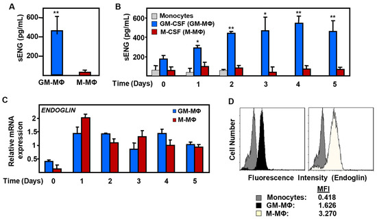 A kinetic study showed that this effect was accumulative and measurable during the monocyte to MΦ transition, and the difference became significant 24 h after monocyte exposure to each cytokine (Figure 4B). By contrast, the levels of sEng released from non-stimulated monocytes were usually below detection range. The preferential presence of sEng in GM-MΦ supernatants agrees with the increased levels of sEng previously found in inflammatory-related pathologies [40,41,43,45,46,47]. Importantly, the differences in sEng levels between both MΦ subsets did not reflect parallel mRNA levels of endoglin (ENG), which were roughly similar between GM-MΦ and M-MΦ all along the differentiation process (Figure 4C). Moreover, significant differences were observed in the cell surface expression levels of endoglin in both MΦ subtypes (Figure 4D). Actually, there was a lower level of surface endoglin in GM-MΦ versus M-MΦ, a finding compatible with an active release of sEng in the GM-MΦ subset. Overall, these results are in line with the hypothesis that membrane endoglin is a target of GM-MΦ MMP-12.