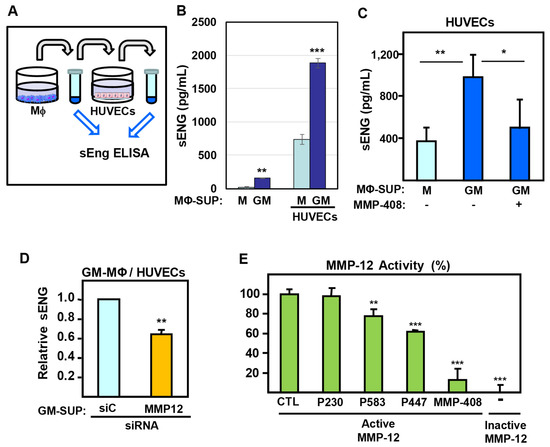 Next, we sought to determine whether GM-MΦ-derived MMP-12 can also act on endothelial cells, which constitute the major source of endoglin. To that end, primary cultures of HUVECs were exposed to GM-MΦ- or M-MΦ-conditioned media (Figure 6A). As shown in Figure 6B, the GM-MΦ-conditioned medium triggered a significantly higher level of HUVEC-derived sEng, as compared to the M-MΦ medium. Of note, the levels of sEng in MΦ-supernatants were much lower than those obtained after incubation with HUVECs (Figure 6B).