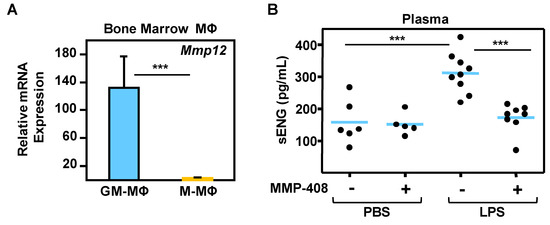MMP-12-dependent release of soluble endoglin in mice. (A) Transcript expression levels of Mmp-12 in murine bone marrow-derived MΦ incubated with GM-CSF (GM-MΦ) or M-CSF (M-MΦ), as determined by qRT-PCR. Statistical significance of data (n = 4) was calculated using a paired, two-tailed Student t test, and data are presented as mean ± SD. (B) Soluble endoglin levels in lipopolysaccharide (LPS)-treated animals. Mice were injected (i.p.) with LPS and orally gavaged with MMP-408 or vehicle (PBS). Plasma samples were extracted, and soluble endoglin was measured using an ELISA kit. A point cloud representation is shown where blue horizontal bars indicate the median values of each condition. Statistical significance was calculated (n ≥ 5) using the ANOVA test, and data are presented as mean ± SD.