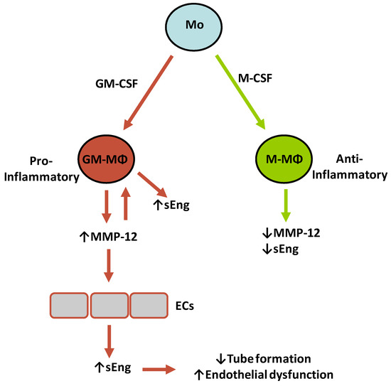 Macrophages regulate a variety of processes involving vascular inflammation. There is a wide range of vascular inflammatory diseases, including atherosclerosis, hypertension, vasculitides aortic aneurism, or rare vascular syndromes [3,7,58]. Together, these are widespread conditions that affect a large population worldwide, sometimes leading to fast and irreversible organ failure. Polarization and accumulation of MΦ upon chronic pro-inflammatory signals may result in extensive vascular damage, adverse repair, and worsened clinical outcomes [59]. Therefore, targeting the inflammatory MΦ activation may lead to an early resolution of inflammation with potential therapeutic benefits. Unfortunately, how MΦ regulate the inflammatory responses in the vasculature is poorly understood. In this context, elucidating novel mechanisms of MΦ polarization may lead to a better understanding of their roles in vascular inflammation. In this manuscript, we report a new link between pro-inflammatory GM-MΦ and endothelial cells, by which GM-MΦ-derived MMP-12 targets membrane bound endothelial endoglin, leading to the release of sEng, a soluble protein with pro-inflammatory properties and the potential to promote endothelial dysfunction in combination with hypercholesterolemia [55]. Our results suggest that there is a direct and synergic effect of both MMP-12 and sEng in the context of the GM-MΦ/pro-inflammatory macrophage response (Figure 8). Supporting this view, it has been reported that in inflammation-associated pathologies in which MMP-12 levels are increased [26,29,60], there is also an augmented level of sEng [44,61,62,63]. Furthermore, we found that GM-MΦ supernatants show an MMP-12-dependent inhibitory activity on endothelial tubulogenesis, which is in agreement with the reported anti-angiogenic effect of both sEng [40,47,53] and MMP-12 [30,31,32,33].