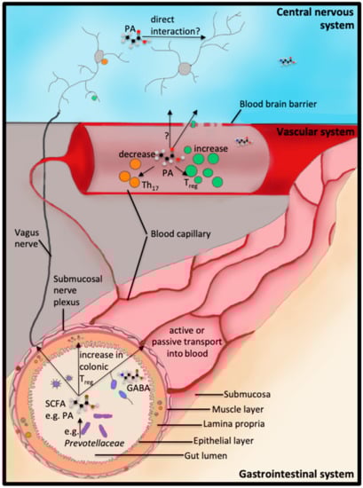 The gut and the brain—interacting systems. The central nervous system is in direct contact with the gastrointestinal system through the enteric nervous system and the vagus nerve. Furthermore, gut microbiome-produced metabolites, like the short chain fatty acid (SCFA) propionic acid (PA) or the neurotransmitter γ-Aminobutyric acid (GABA), can take the indirect route of the vascular system to finally reach the central nervous system (CNS).