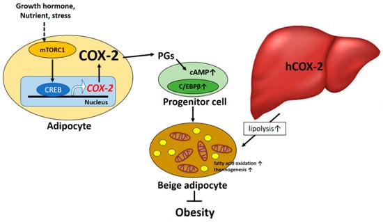 - Zhang, X.; Luo, Y.; Wang, C.; Ding, X.; Yang, X.; Wu, D.; Silva, F.; Yang, Z.; Zhou, Q.; Wang, L.; et al. Adipose mTORC1 Suppresses Prostaglandin Signaling and Beige Adipogenesis via the CRTC2-COX-2 Pathway. Cell Rep. 2018, 24, 3180–3193. [Google Scholar] [CrossRef]