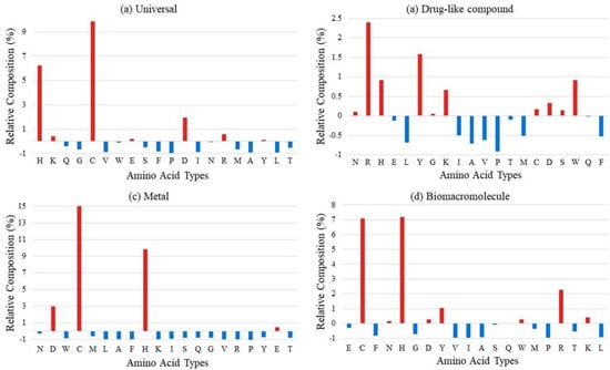 The relative composition of (a) universal ligand-binding residues, (b) drug-like compound-binding residues, (c) metal-binding residues, and (d) biomacromolecule-binding residues based on background distribution of all residues in corresponding datasets.