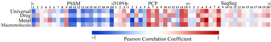 As described in Section 3.2, “Selected Features”, we employed four kinds of features to construct the feature spaces of the predictor. To evaluate these features, we calculated the Pearson correlation coefficient between features and labeled the universal and ligand-specific training datasets. As shown by the heat map in Figure 3, the features of PSSM reveal the highest negative correlation with the label. The features of PCP also show significant correlations on all datasets. The features of TOPO and SeqSeg show a lower correlation with labels, which might be because the feature vector was too sparse. In a point-by-point comparison among the universal and ligand-specific datasets, the linear correlation between features and labels is relatively lower on drug-like compound data and significantly higher on metal data. This phenomenon is consistent with the experimental results.