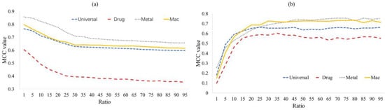 The tendency of MCC value as the ratio of non-binding residues and binding residues increase over (a) 10-fold cross-validation test and (b) independent validation test.