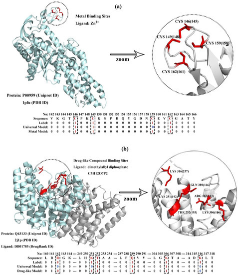 Visualization of membrane protein-ligand binding sites and their corresponding prediction result generated by MPLs-Pred with the universal model and ligand-specific models. As examples: (a) P00959: metal-binding MP with four zinc ion-binding residues, and (b) Q43133: drug-binding MP with six dimethylallyl diphosphate-binding residues.