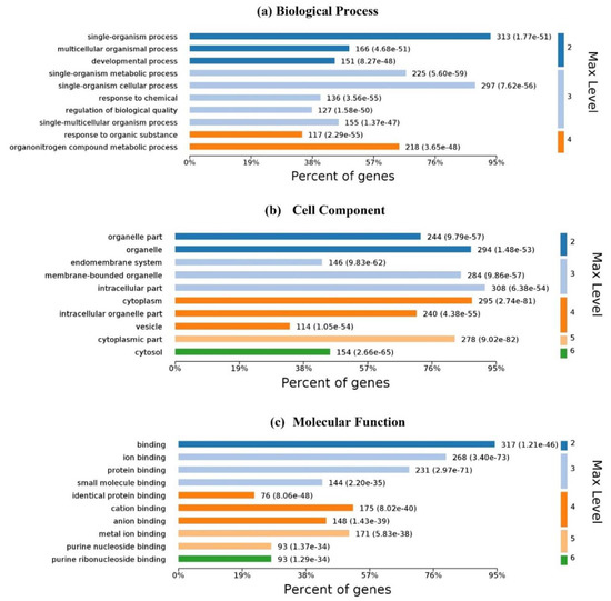 Gene ontology (GO) is an important initiative to unify the representation of gene and gene product attributes across all species. The enrichment analysis is to test whether a GO term is statistically enriched for any given data. Figure 6 illustrates the GO analysis with up to 10 significantly enriched terms in (a) biological process (BP), (b) cell component (CC) and molecular function (MF), respectively. For 337 Homo’s proteins in the proposed dataset, 6100 biological processes are enriched and 4248 are statistically significant. Single-organism processes are the most important biological process for homo MPs. Six hundred and forty-two (642) cell components are enriched and 401 are statistically significant. Intracellular, cytoplasmic, and organelle are the top three CC enrichments, but they are not much better than others; membrane proteins are distributed in almost all organelles without significant difference. One thousand one hundred and fifty-three (1153) molecular functions are enriched and 561 are statistically significant. Binding with ligands is the most important function of membrane proteins.
