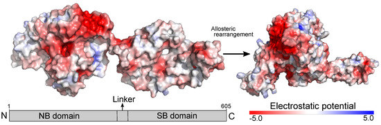 Overview of the allosteric rearrangement and electrostatic potential of HSP70. The protein structures (IDs 2KHO and 4B9Q) were retrieved from the Protein Data Bank and depicted to show the allosteric rearrangement [ADP (left) and ATP (right) bound states] and electrostatic potential of HSP70. The electrostatic potential was computed using the Adaptive Poisson-Boltzmann Solver (APBS) electrostatics plugin in the software PyMol (version 2.2.0) and it is shown in a red (negative) to blue (positive) scale.