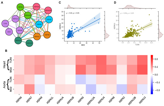 Evidence of protein-protein interaction in cardiovascular tissues. (A) Network interactivity of the genes of HSP70-family, TLR4 and MD2. Nodes are colored according to the community determined by the Louvain modularity algorithm. (B) Pearson correlation matrix of HSP70-family with TLR4 and MD2 transcriptome expression levels of heart (left ventricle) and aortic human tissues plotted in a red (positive correlation), white (no correlation), and blue (negative correlation). (C,D) Scatter plots of the relationship between expression values in heart (left ventricle) of HSPA13 with MD2, and TLR4 respectively, as well as Pearson correlation coefficient.