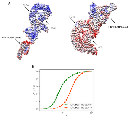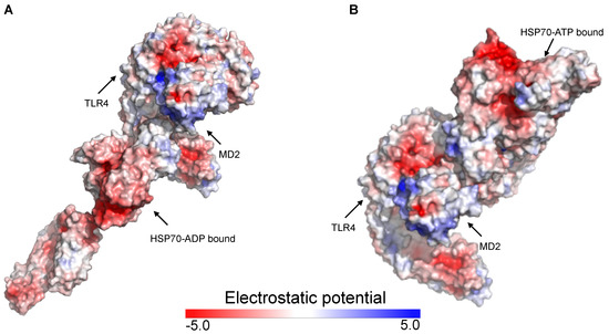 The proteins within the HSP70 family are pervasive across all domains of life [24] having considerable sequence similarity among them [25,26]. Most of our understanding of the 3D structure and allosteric rearrangement of HSP70 comes from work conducted with the prokaryotic homologous DnaK [27,28]. Studies conducted with this protein showed that HSP70 has two conserved domains [nucleotide-binding domain (NBD) and (substrate-binding domain (SBD)] [29,30]. While the SBD binds client proteins, the NBD binds and hydrolyzes ATP. Hydrolysis of ATP regulates the thermodynamics and kinetics of the reactions where HSP70 is involved [27]. Likewise, the overall 3D structure of the protein undergoes extensively allosteric rearrangement upon hydrolysis of ATP, which affects substrate affinity [30,31]. HSP70 in its ADP state has a high affinity for substrates at the expense of reducing the rate of reactions, whereas HSP70 in its ATP state depletes substrate affinity and increases the speed of the reaction [27,29,30]. Besides changes in its 3D structure, the rearrangement cycle undergone by HSP70 affects the overall distribution of the electrostatic potential in the surface of the molecule. As shown in Figure 1, HSP70 has a negative surface potential, which might favor the interaction with positively charged receptors [32] such as the co-adaptor MD2 [33], a protein known for physically associating with TLR4 [34].