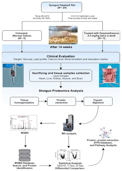 A standard protocol of housing the study’s male SD rats was adopted, where the age of the rats ranged from 6 to 8 weeks (weight: 200–250 g). These rats were housed at the Department of Comparative Medicine under standard environmental conditions: temperature (20–24 °C), humidity (45–50%), and 12 h/12 h light/dark cycle with free access to food and water. Rats were randomly separated into two groups; Dex (n = 10) and control (n = 10) group. The Dex group was injected intramuscularly with 2.5 mg/kg twice a week for 14 weeks with Dex while the control with normal saline. This method was developed earlier by Li et al. [] and Huang et al. [] who considered giving equivalent long-term treatment of the drug for a chronic disease to develop the serious side effects of the drug. The clinical phenotype, anesthesia protocol, and the routine blood work analysis were monitored during this study and detailed previously []. After 14 weeks post-treatment, the animals were sacrificed (n = 5/group) and their major organs (brain, heart, muscle, liver, and kidney) collected, snap-frozen in liquid nitrogen, and then stored at −80 °C for further proteomics analysis. The other 5 animals included in the study were used for radiological studies as reported elsewhere [].