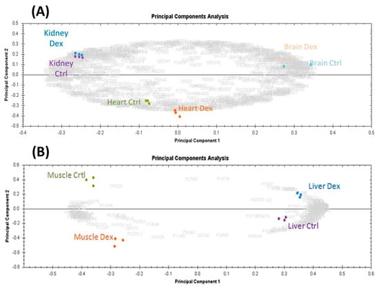 The protein expression datasets obtained after LC MS/MS mass spectrometric analysis, in samples from each of the individual organs, were compared by running a principal component analysis (PCA) analysis. The PCA plots constructed from them showed a clear separation between the control and Dex-treated samples for the brain, kidney, heart, and muscle samples (Figure 2A) and skeletal muscles and liver (Figure 2B).