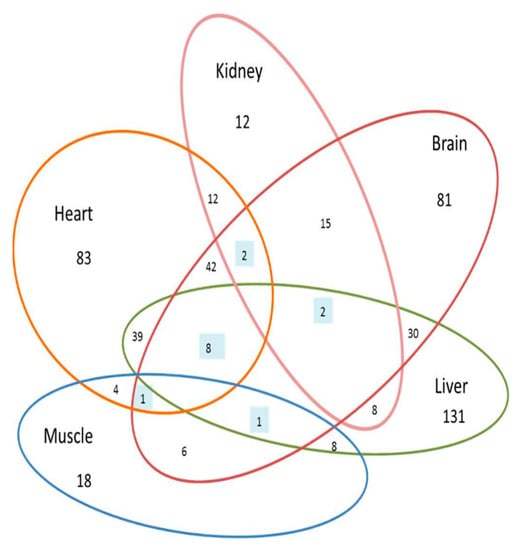 Organ-specific proteome expression: Venn diagram representation of the differentially expressed significant proteins (p ≤ 0.05, 1.5 fold change) identified within the morphologically altered organs from Dex-treated and control animals. Number of proteins expressed in common among various organs are shown in the intersections. The number of proteins specific for each organ namely the heart (n = 83), kidney (n = 12), brain (n = 81), liver (n = 131), and muscle (n = 18). The highest number of overlaps was found to be between the heart and brain (n = 42) followed by the heart and liver (n = 39) and the liver and brain (f = 30), while only eight proteins were common among the three groups and no proteins were in common between the muscle and kidney. The area of the Venn diagram is not representative of the numbers of identified proteins.