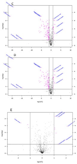 Plots showing the statistically significant expressed proteins in brain tissue (A), heart (B), skeletal muscle (C), liver (D), and kidney (E) after prolonged Dex administration false discovery rate (FDR-corrected p-value < 0.05), and fold change FC > 1.5 were visualized in each volcano plot in the left and right corners as down- and upregulated, respectively, in the Dex-treated rats.