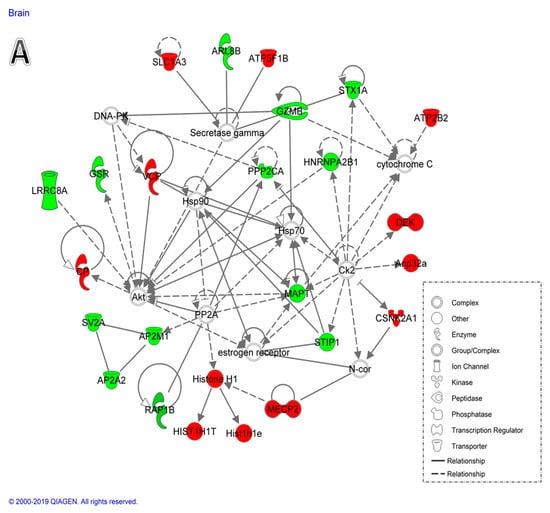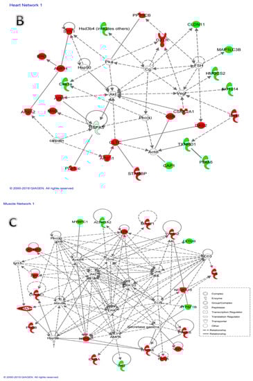 The differentially abundant protein sets identified from the brain, heart, muscle, liver, and kidney tissues were next uploaded and investigated further using the ingenuity pathway analysis (IPA) software to determine their functional and biological roles.
