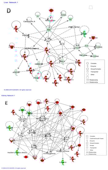 Network analysis of the differentially expressed proteins between the Dex-treated and control rats in the brain identified the pathway with the highest score, related to cell morphology, nervous system development, and function and neurological disease (score = 38) (Figure 5A). The central node of the identified pathway was mitogen–activated protein (MAP) kinase whose activity was suggested to be reduced in the Dex-controlled rats versus controls. In the heart tissue, the pathway identified was related to cellular development, cellular function and maintenance, and connective tissue development and function (score = 43) (Figure 5B) with the protein kinase B (Akt) as its central node. The pathway identified in the muscle with the highest score related to nucleic acid metabolism, small molecule biochemistry, and vitamins and mineral metabolism (score = 50) (Figure 5C), and identified janus kinases (Jnk), protein kinase C, insulin, and extracellular-signal regulated kinases ERK as the central nodes involved in the regulation of Dex action. The highest scoring network pathway identified in the rat liver related to lipid metabolism, small molecular biochemistry, and nucleic acid metabolism (score = 41) (Figure 5D), and identified Akt and phosphoinositide 3-kinase (PI3 kinase) as the central nodes. In the kidney, the pathway identified with the highest score was related to drug metabolism, organism injury, and abnormalities and renal damage (score = 41) (Figure 5E), and showed Jnk, ERK, insulin, nuclear factor kappa-light-chain-enhancer of activated B cells NFkB, and p38 MAP kinases as the central nodes.