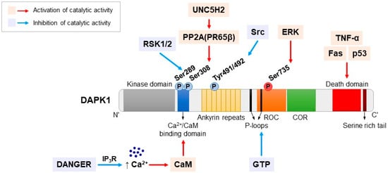 DAPK1 is the largest protein kinase of in the DAPK family and is composed of 1431 amino acids [22]. It consists of multiple distinct domains and motifs, including an N-terminal kinase domain, a Ca2+/CaM-binding autoregulatory domain, eight ankyrin repeats, two putative P-loops, a Ras of complex (ROC) domain, a C-terminal of ROC (COR), a death domain and a Ser-rich C-terminal tail (Figure 1) [14,22]. These distinct DAPK1 domains and motifs have specific functions, such as the regulation of catalytic activity, degradation, localization and interactions with its substrates and binding partners [23].