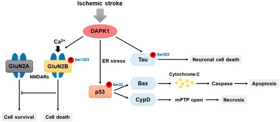 DAPK1 phosphorylates p53 at Ser23 by the direct binding of the DAPK1 death domain to the DNA binding motif of p53 (residues 270–281) [79]. In primary cortical neurons in mice, the DAPK1-mediated phosphorylation of p53 increases the transcriptional induction of pro-apoptotic genes such as Bax in the nucleus, whereas it induces necrosis through its interaction with cyclophilin D (CypD) in the mitochondrial matrix [79,80]. However, the deletion of the DAPK1 death domain or the p53 DNA binding motif that interferes with DAPK1-p53 interaction blocks neuronal death signaling mechanisms [6,79]. Therefore, the interaction between DAPK1 and p53 is a crucial signaling mechanism for the convergence of apoptotic and necrotic mechanisms [81].