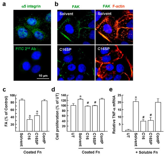 HaCaT cells are immortalized human adult keratinocytes and are often used as a cellular model of psoriasis [18]. Moreover, expression of the integrins α5 and β1 in HaCat cells suggests that these play a role in maintaining keratinocyte proliferation in culture [18,19,20]. Our immunofluorescence staining study also showed the α5 integrin expressed in HaCat cells (Figure 1a). We first determined the effect of C16 on Fn-mediated focal adhesion (FA) formation. Serum-starved subconfluent HaCat cells were cultured on glass coverslips precoated with Fn. Immunofluorescence staining of FA components, including focal adhesion kinase (FAK) and F-actin, showed that nearly 86% of cells were expressed marked FA and formed fine stress fibers (Figure 1b,c; C16 solvent as control). In contrast, following C16 and C16SP treatment for 3 h, the FA-expressing cells were significantly reduced to levels of approximately 33% and 43%, respectively. Control peptide (NITYVALKF) had no effect on the α5β1 integrin/Fn-induced cytoskeletal responses.
