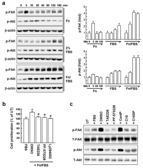 Psoriatic epidermis formed by the hyperproliferation of keratinocytes is one of major sources of inflammatory mediators in skin lesions [1,22]. We investigated the molecular mechanism of integrin and growth factor receptor signaling on HaCat cell proliferation to understand more how C16 provides a novel strategy for psoriasis therapy. Fn induces FAK autophosphorylation on the Tyr397 residue (p-FAK) that has been shown to be crucial for α5β1 integrin-mediated signaling cascades involved in cell adhesion, migration, and proliferation [23]. In addition, Tyr397 phosphorylation is a key event for subsequent full activation of FAK [24,25]. As expected, serum-starved HaCat cells treated with Fn underwent transient p-FAK induction at 5 min, assessed by western blot analysis (Figure 2a). As shown in Figure 1d, serum-starved HaCat cells, exposed to Fn in combination with 2% FBS (Fn/FBS), showed significant proliferation. Further, 2% FBS treatment increased the levels of p-FAK at 40~180 min compared to untreated cells (0 min). In particular, we observed that stimulation of cells with Fn/FBS caused a synergistic induction of the Tyr397 phosphorylation by ~2-fold, compared to 2% FBS, over the time period examined. Phosphoinositide 3-kinase (PI3K)/protein kinase B (Akt) has been reported to be one of the main signaling molecules positioned downstream of FAK [26]. Western blot analysis revealed that phosphorylation of Akt on Thr308 (p-Akt) was slightly increased upon FN stimulation at 5~40 min. HaCat cells exposed to 2% FBS had levels of p-Akt increased by ~2-fold at all time points (5~180 min) compared to untreated cells. Moreover, Fn/FBS substantially induced the levels of p-Akt by ~2-fold compared to 2% FBS at time points from 10 to 180 min. These results imply that the association of α5β1 integrin with Fn is linked with serum factors-mediated signaling to synergistically potentiate FAK/PI3K/Akt signaling in HaCat cells.