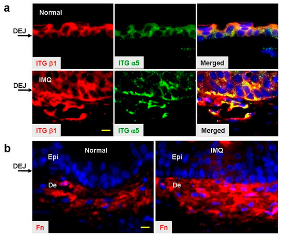 Immunofluorescence analysis of mouse dorsal skin six days after Imiquimod (IMQ) treatment. (a) Representative skin sections from mice treated with control cream (normal) or IMQ cream, and dual-immunofluorescence stained for integrin (ITG) α5 and β1. Nuclei were stained by Hoechst 33258 (blue). DEJ: Dermal–epidermal junction. (b) Representative images of fibronectin (Fn) staining of normal and IMQ-treated skins. Epi: Epidermis; De: Dermis. Scale bar: 10 µm. Results were evaluated from six sections of a skin specimen, with three mice in each group.