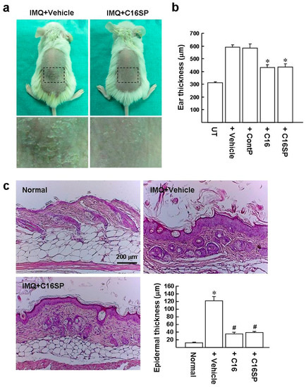C16 and C16SP improve the symptoms of IMQ-induced psoriasis. BALB/c mice (eight-week-old) received a daily topical treatment with IMQ cream on the shaved back and right ear for six consecutive days. (a) Physical appearance of the back skin at the end of the study. Insert: Back skins photographed at higher magnification with a light-field camera. (b) Ear thickness measured by digital micrometer. * p < 0.001 versus IMQ/vehicle-treated group. (c) Histopathological examination of H&E stained dorsal skin. Representative images from three independent experiments with six mice per group are shown. The measurement of epidermal thickness is described in the Methods. Results are expressed as mean ± SD. * p < 0.0001 versus normal control group. # p < 0.0005 versus IMQ/vehicle treatment.