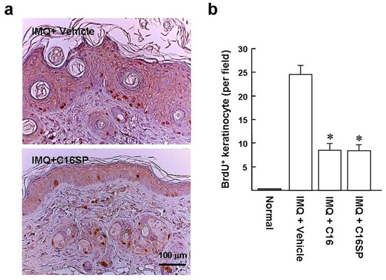 Hyperproliferation of keratinocytes is one of the main manifestations of psoriatic lesions. We monitored the IMQ-induced keratinocyte proliferation by BrdU labeling to investigate the acanthosis suppressed by the C16. Mice back skins were treated with IMQ for five days and then intraperitoneally injected with BrdU for another 24 h. Immunohistochemical analysis of the IMQ/vehicle group showed that the BrdU-positive cells were mostly distributed in the basal layer of the epidermis with dysregulated proliferation, in comparison with IMQ/C16SP (Figure 5a). Statistically, the numbers of IMQ-induced BrdU-positive basal cells were significantly reduced in mice treated with C16 and C16SP, compared with vehicle treatment (200× field: 8.5 ± 1.4 and 8.3 ± 1.4 versus 24.5 ± 2.0; Figure 5b). Collectively, these data suggest that C16 and C16SP are capable of improving the symptoms of psoriasis.