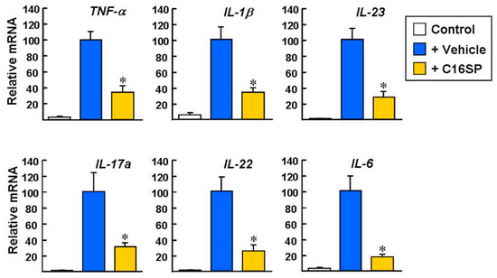 The development of IMQ-induced psoriasis is dependent on several inflammatory cytokines. After IMQ/vehicle stimulation for four consecutive days, the levels of inflammatory cytokines were evaluated by real-time qPCR. The expression levels of the TNF-α, IL-1β, IL-23, IL-17A, IL-22, and IL-6 genes were significantly increased in the skin stimulated by IMQ/vehicle, compared with the untreated control group (Figure 6; IMQ/vehicle set as 100%). Notably, these cytokine gene expression levels were markedly reduced in the IMQ/C16SP group, by a factor of 3~5-fold.