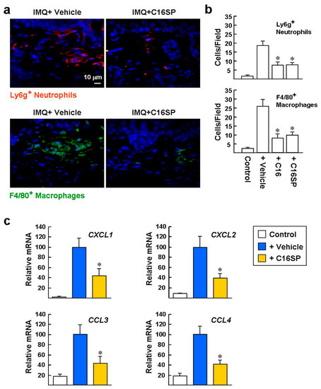 Neutrophil chemoattractants CXCL1/CXCL2 (CXC chemokine ligands 1/2) are expressed abundantly in lesional psoriatic skin and are produced by keratinocytes upon stimulation by T helper type 17 (Th17) cytokines (such as IL-17 and IL-22) and TNF, contributing to pathogenic recruitment of neutrophils [2,31]. Th17 cytokines also induce psoriatic skin expressing macrophage chemokines, including CCL3 and CCL4 [2,32]. Furthermore, macrophages activated by inflammatory triggers also produce CXCL1 and CXCL2 [33]. To directly link the reduced infiltration of neutrophils and macrophages observed in the mice treated with both IMQ and C16, we investigated the expression of these chemokine genes by real-time qPCR assay. CXCL1/2 and CCL3/4 mRNA levels were significantly increased in the skin stimulated by IMQ, compared with the cream vehicle control group (Figure 7c). In contrast, expression of these chemokine genes was significantly reduced in the IMQ/C16SP group, by a factor of ~2.5-fold. Taken together, our results indicate that C16 and C16SP can ameliorate IMQ-induced skin inflammatory responses in mice, including infiltration of neutrophils and macrophages, as well as expression of a series of inflammatory genes.