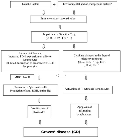 Pathogenesis of Graves’ disease (GD). * viral and bacterial infections, iodine, stress, medications, external radiation, radioactive iodine, toxins, selenium and vitamin D3 deficiency, lymphopenia, smoking, CD8+ T lymphocyte deficiency [,,,,,,].