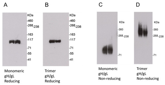 Synthesized DNA coding for monomeric or trimeric gH/gL was cloned into pOptiVEV (Thermo Fisher Scientific, Waltham, MA, USA) and transfected CHO cells. Following selection with increasing concentrations of methotrexate, stable gH/gL expressing CHO cell lines were generated by limiting dilution cloning. Then, CHO cells were cultured in a FiberCell bioreactor (FiberCell Systems, Frederick, MD, USA). The supernatants were concentrated for affinity purification using a cobalt column (Thermo Fisher Scientific, Waltham, MA, USA), and further purified using size exclusion chromatography on a Superdex 200 column (GE Lifesciences, Pittsburgh, PA, USA). Western blot analysis of the monomeric gH/gL protein using an anti-HCMV gH monoclonal antibody under either reducing conditions or modified non-reducing conditions demonstrated a single size band of ~110 kDa, which is consistent with gH/gL heterodimers (Figure 2A,C). Western blot analysis of the trimeric gH/gL protein under reducing conditions disrupted the trimeric structure, and showed a single size band of ~110 kDa (Figure 2B). Under modified non-reducing conditions, Western blot analysis of the trimeric gH/gL protein demonstrated a single size band of ~330 kDa, which is consistent with a trimer of the gH/gL heterodimer (Figure 2D).